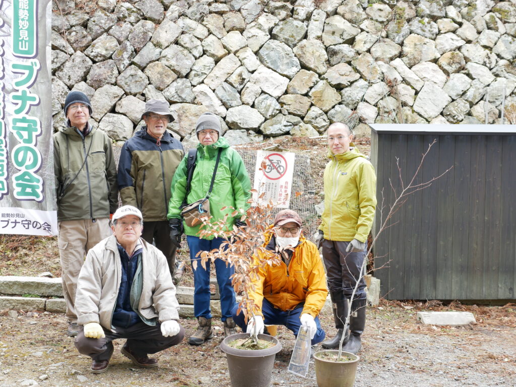 このブナは、数少ない樹齢10年を超えた個体です。当初境内の育苗エリアで管理していたもですが、夏季の水切れで枯れかかったいたものを副会長の自宅でリハビリしてきたものです。順調に回復し十分に大きくなり今回故郷に戻ってきました。