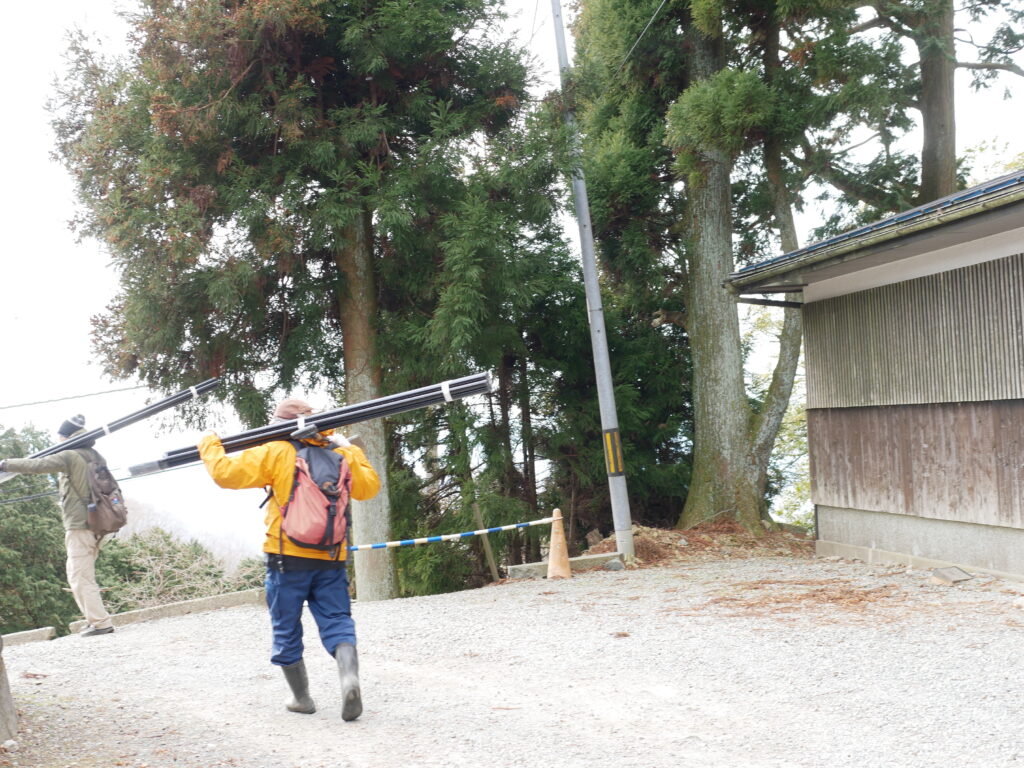今回の設置場所は、信徒会館星嶺南西側の尾根南側としました。この場所は日当たりが良く先に植樹した防鹿柵内のブナもしっかり定着している場所です。先月の活動でも使用したセパレートタイプの防鹿柵材料を運搬しました。