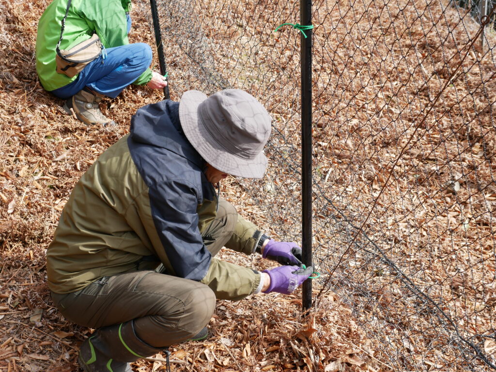 網を支柱に固定します。この網は、シカに破られないように金属ワイヤーが織り込まれている特殊なものです。最近は獣害対策で作業のしやすい適正なのもが市販されてきています。